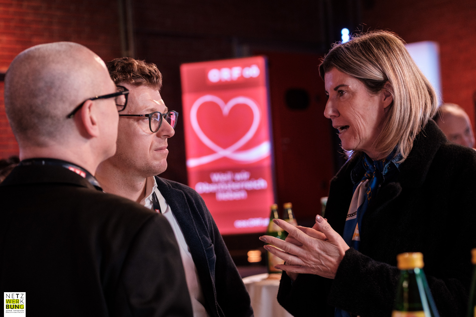 Besucherin im Gespräch mit zwei anderen Denkfrühstück-Besuchern